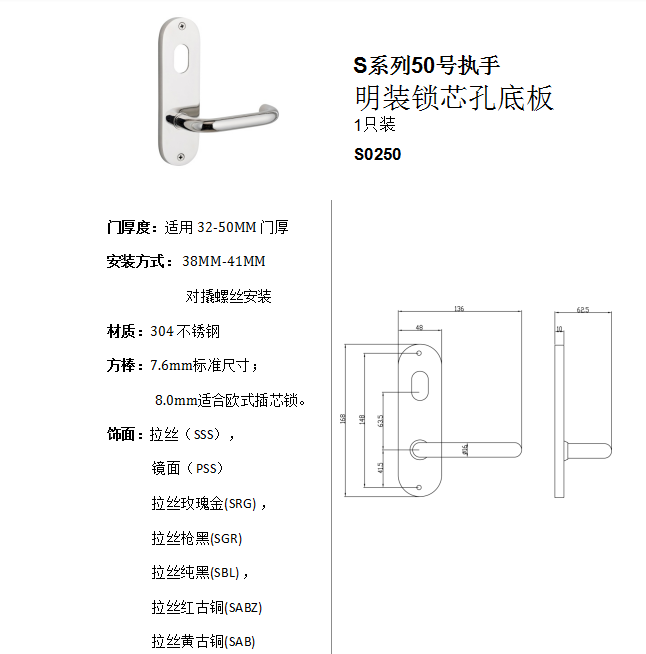 S系列作品50號執手 明裝防盜鎖芯孔底板