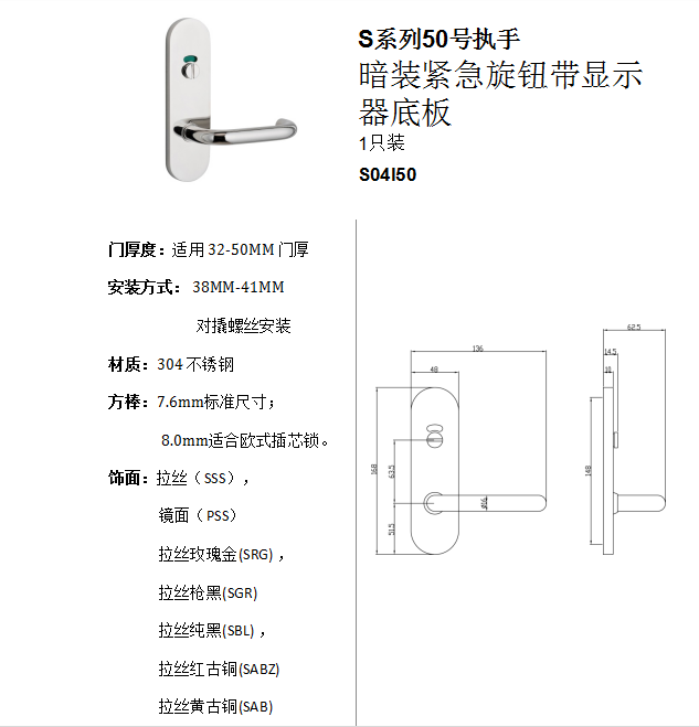 S系列50號執手 暗裝告急旋鈕帶顯現器底板