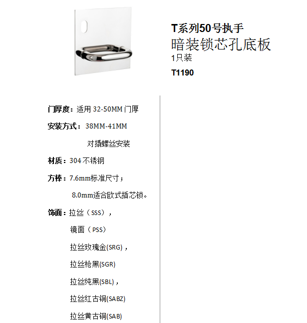 T系列50號執手 暗裝鎖芯孔底板